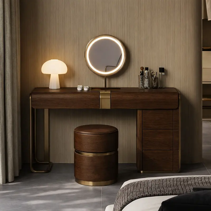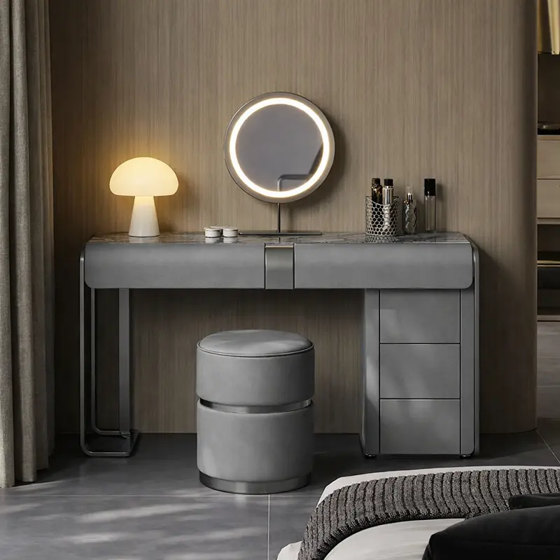 طاولة التسريحة مصنوعة من هيكل خشبي هندسي وخشب زان روماني عالي الجودة، مما يضمن متانتها وطول عمرها. تم تجهيز الطاولة بقاعدة معدنية متينة ومغطاة بالجلد الإيطالي الفاخر، مما يضفي عليها مظهراً راقياً. بفضل تصميمها العملي، يمكن تنظيفها بسهولة فقط عند الحاجة.