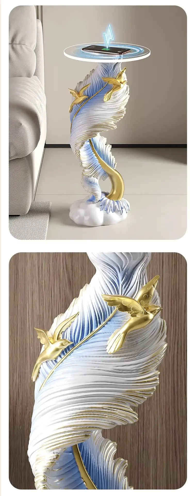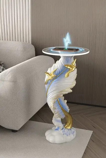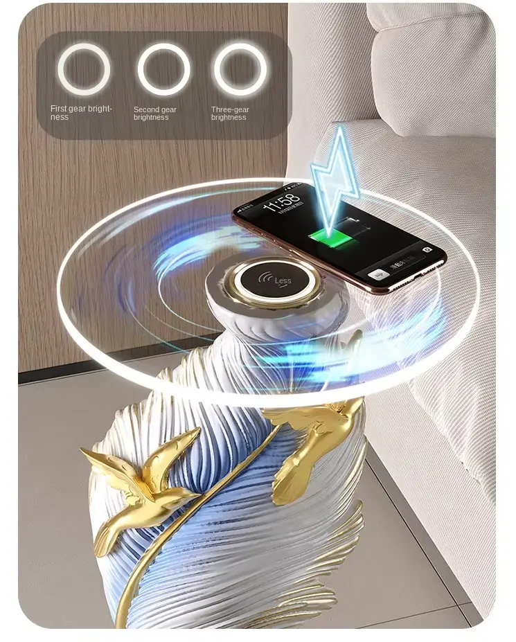 تم تصنيعها باستخدام مواد عالية الجودة، حيث تتكون من معدن صلب يمنحها المتانة والاستقرار. يتميز سطحها بزجاج ذكي يمكن شحن الهاتف لاسلكيًا، مما يجعلها ليست مجرد طاولة ولكن أيضًا جهازًا عمليًا.