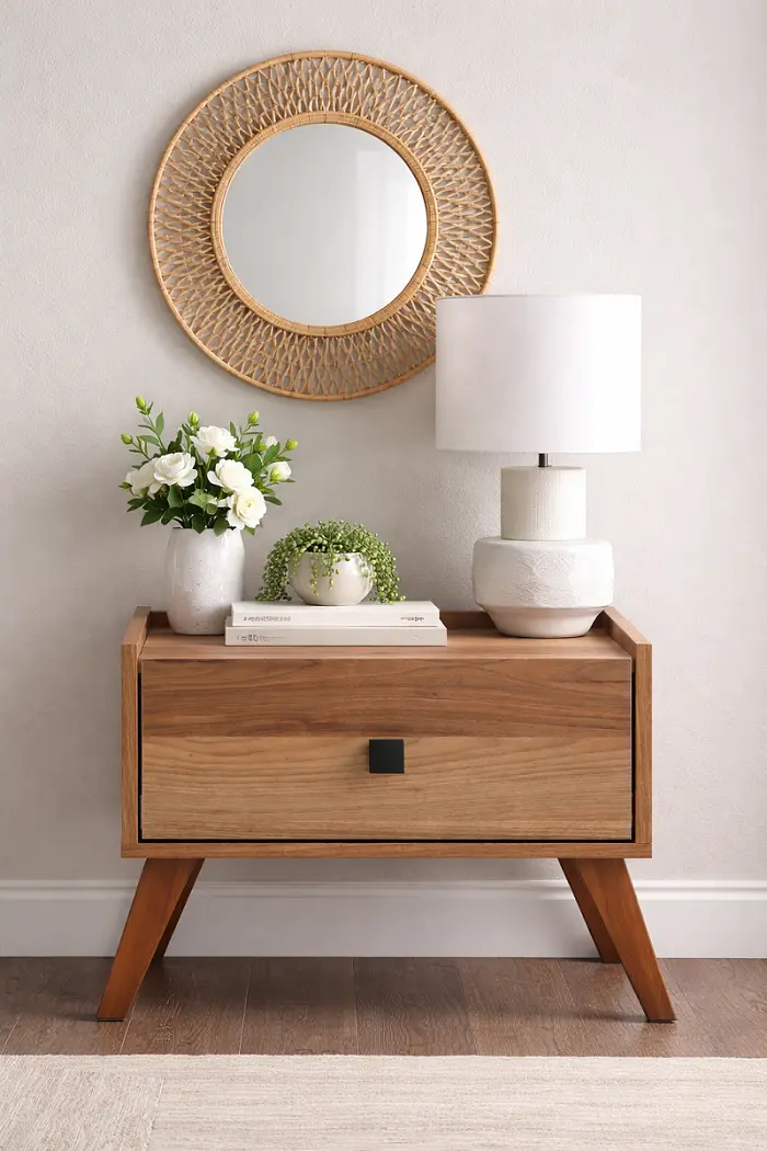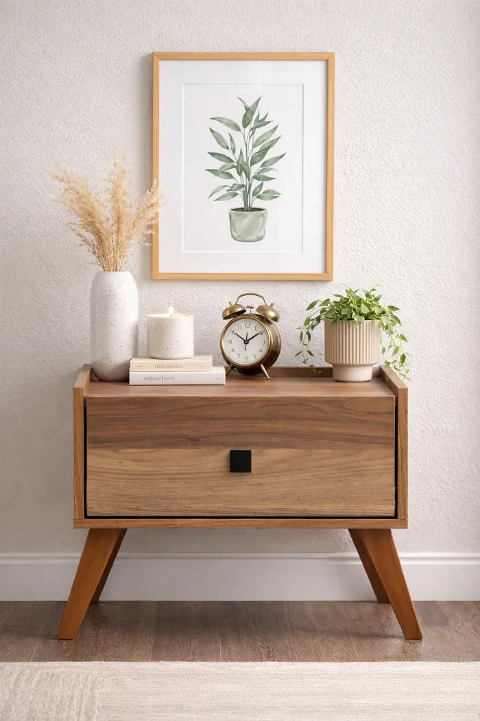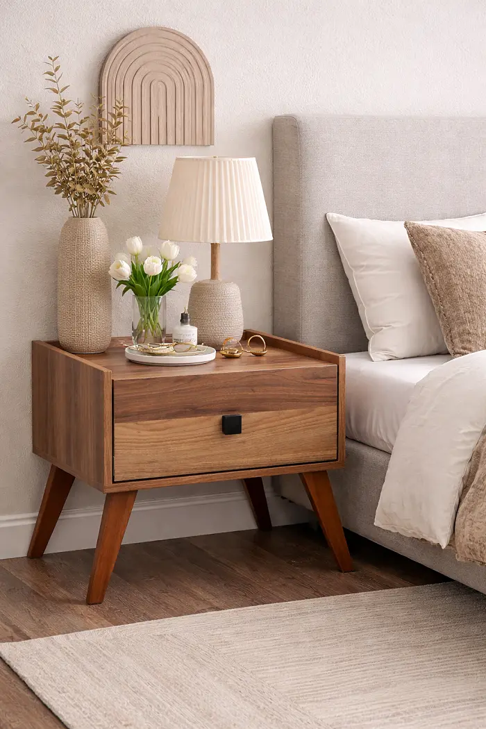 تم تصميم الكومودينة لتكون بجانب السرير وتوفر وصولًا سريعًا للأغراض الأساسية. السطح العلوي مناسب لوضع الإضاءة أو العناصر اليومية، بينما المساحة الداخلية تساعد في تنظيم المتعلقات بشكل مرتب داخل غرف نوم جاهزة أو مخصصة.