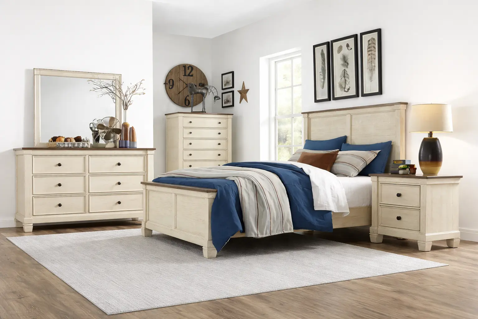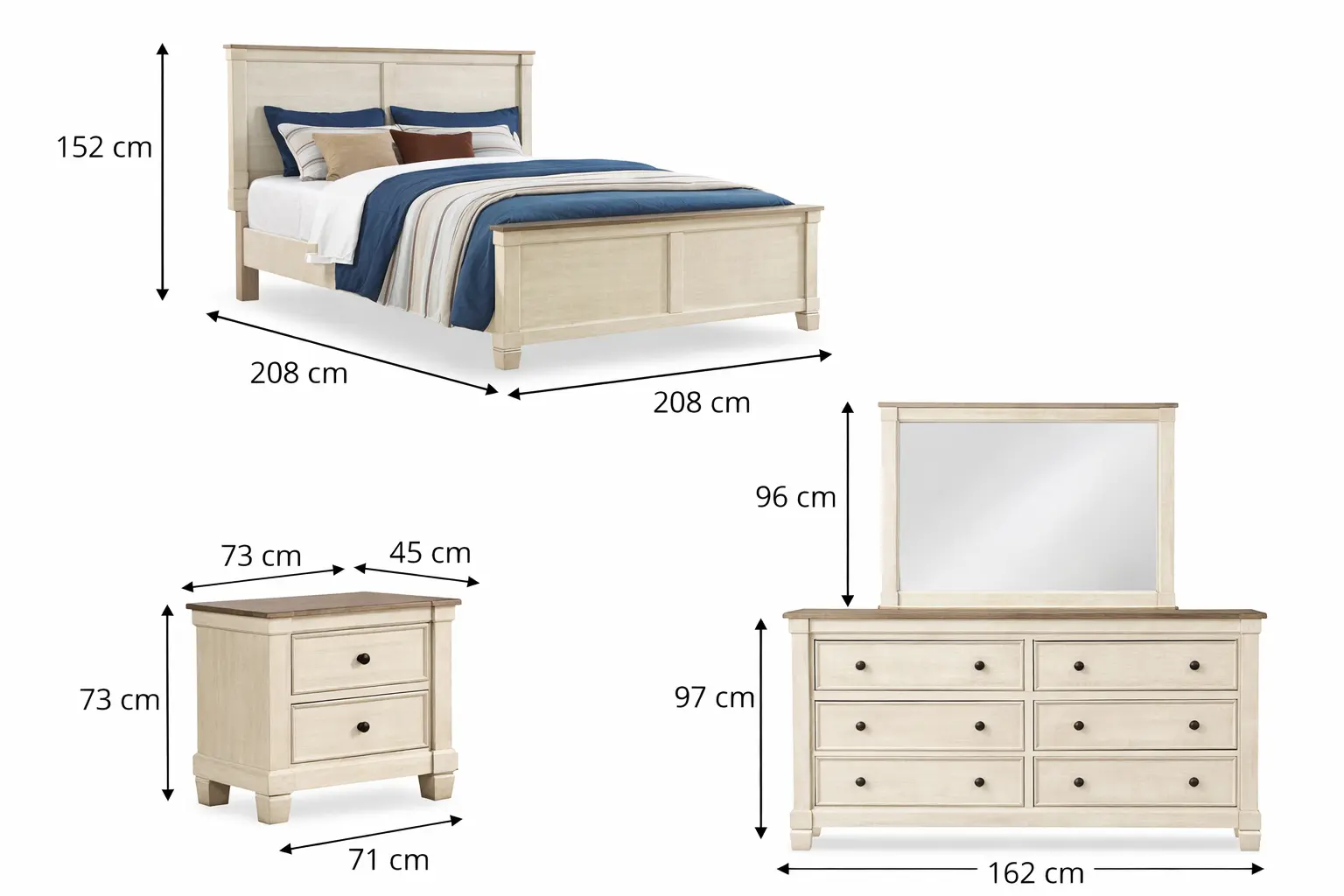 يتكون الطقم من سرير مريح، كومود، وتسريحة مع مرآة، مما يوفر حلاً متكاملاً لتنظيم غرفة النوم دون الحاجة إلى إضافة قطع أخرى. هذا التكامل يجعله مناسبًا للاستخدام اليومي ويمنح المساحة ترتيبًا واضحًا.