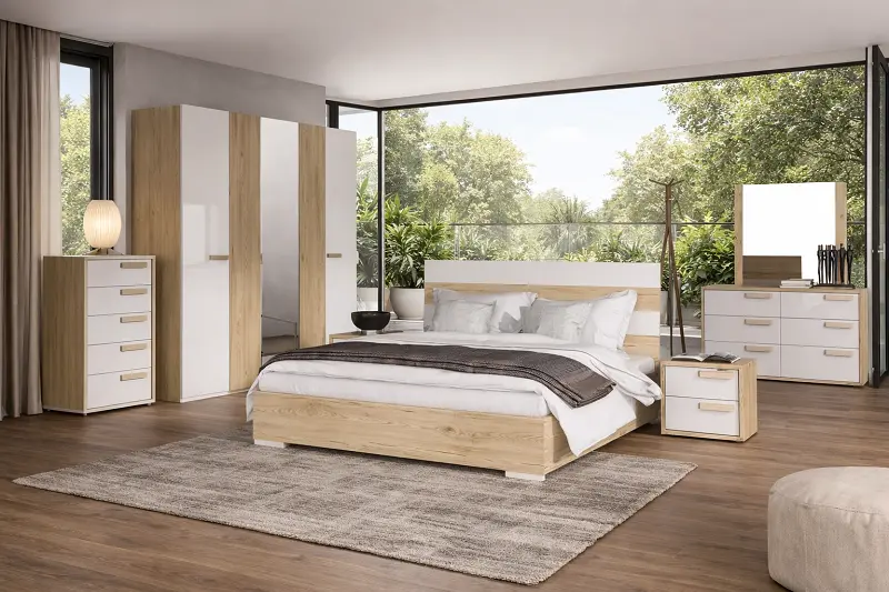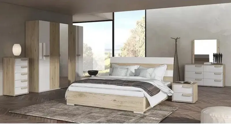 جدد غرفة نومك وأضف لمسة من الفخامة والأناقة مع طقم الغرفة الرائع بتصميم ترينتو من اركان القصر. يتكون هذا الطقم المتكامل من 5 قطع أساسية، حيث يشمل سرير كينج الأنيق وطاولتي سرير جانبيتين لتكملة المظهر، وطاولة تزيين رائعة، ومرآة أنيقة لإبراز جمال الغرفة.