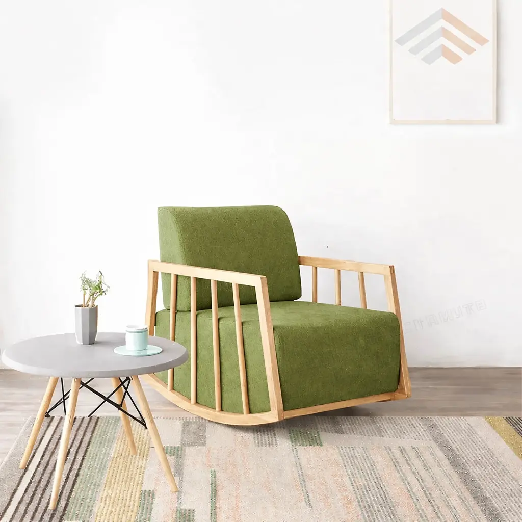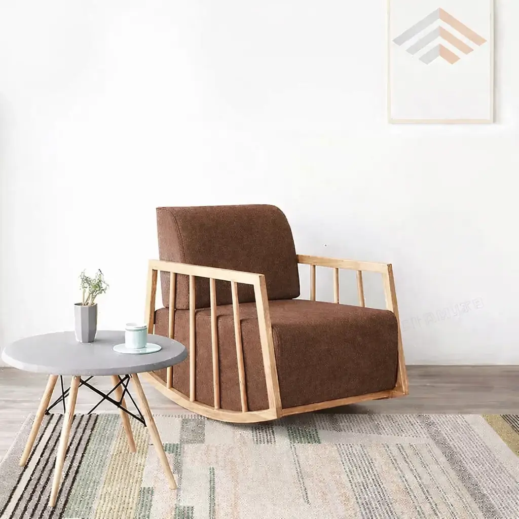 المقعد مبطن بحشوة مريحة تساعد على دعم الجلوس بصورة أفضل، وهذا ما يجعل كرسي هزاز للمعيشة مناسبًا للاستخدام اليومي داخل المنزل. كما أن التصميم الحديث ينسجم بسهولة مع أنماط متعددة من اثاث منزلي معاصر، سواء كانت المساحة تعتمد على البساطة أو على القطع ذات الحضور الواضح.