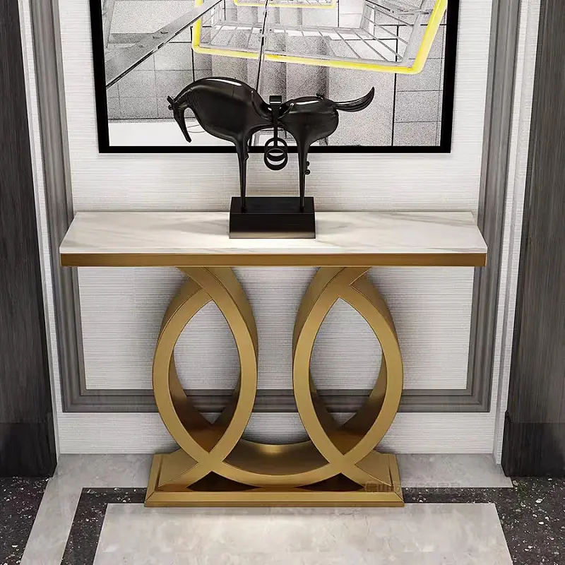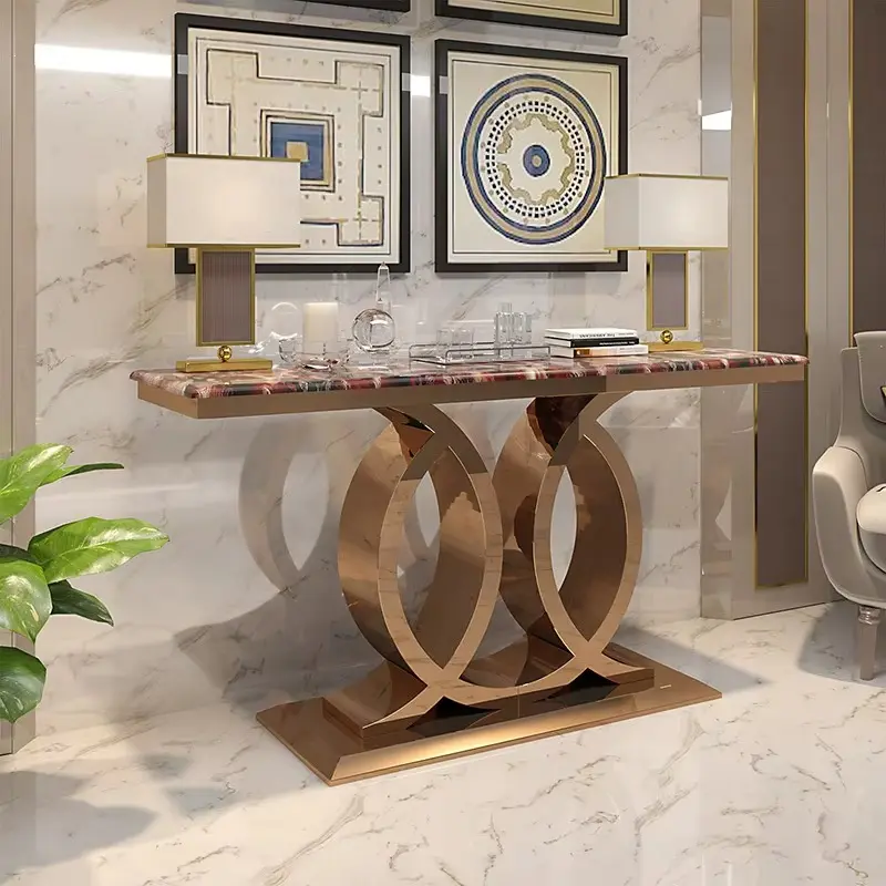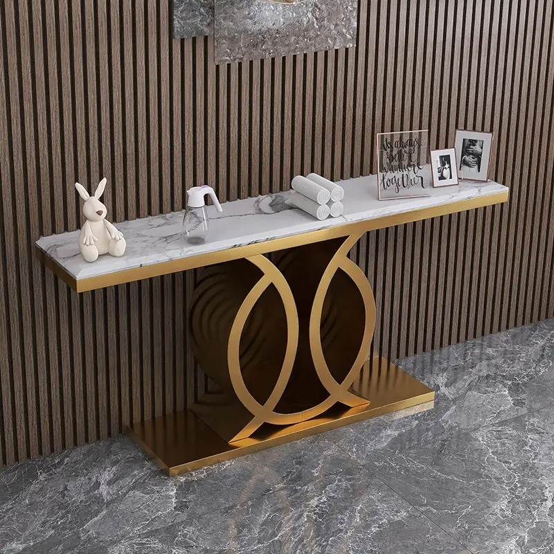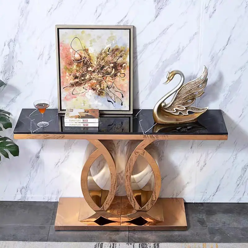 طاولة كونسول رخامية بتصميم حديث تُعدّ قطعة أثاثٍ أنيقة وعملية تُضفي لمسةً من الفخامة على أيّ مساحةٍ تُوضع فيها. تُستخدم بشكلٍ أساسيّ في مدخل المنزل، حيث تُستخدم لوضع المفاتيح والحقائب والاكسسوارات الأخرى. كما يمكن استخدامها في غرف المعيشة أو غرف الطعام كطاولةٍ جانبيةٍ لوضع الزينة أو الشموع أو الكتب.