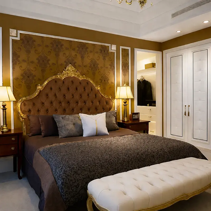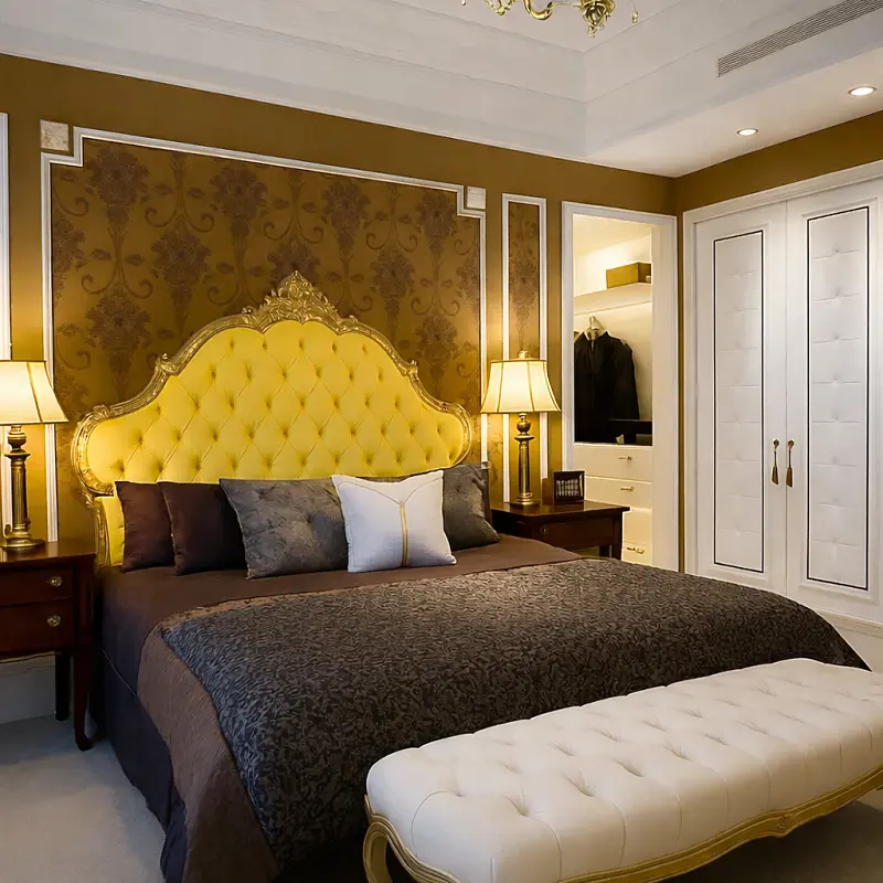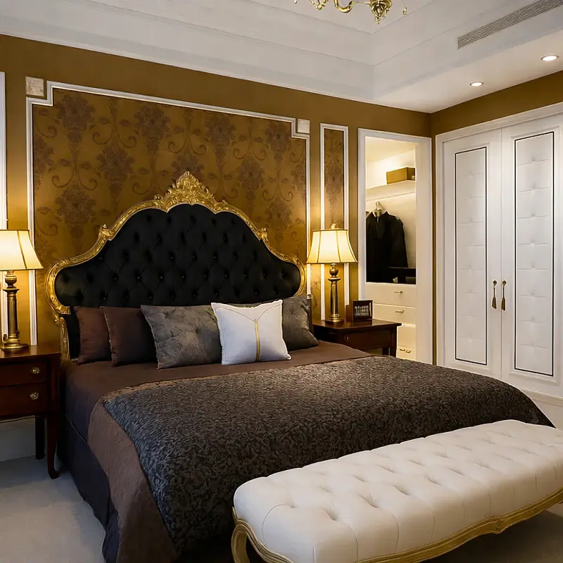 اجعل غرفة نومك تتألق بلمسة من الرفاهية والجمال مع السرير الملكي والإكسسوارات الفاخرة المرافقة. اختر هذا المنتج الرائع من متجر أركان القصر للأثاث، واستمتع بالجمال والراحة في كل لحظة.